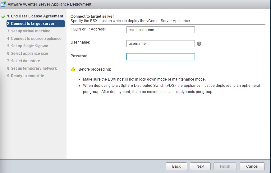 – Enter an ESXi host that you’d like to deploy the new vCenter Appliance too.