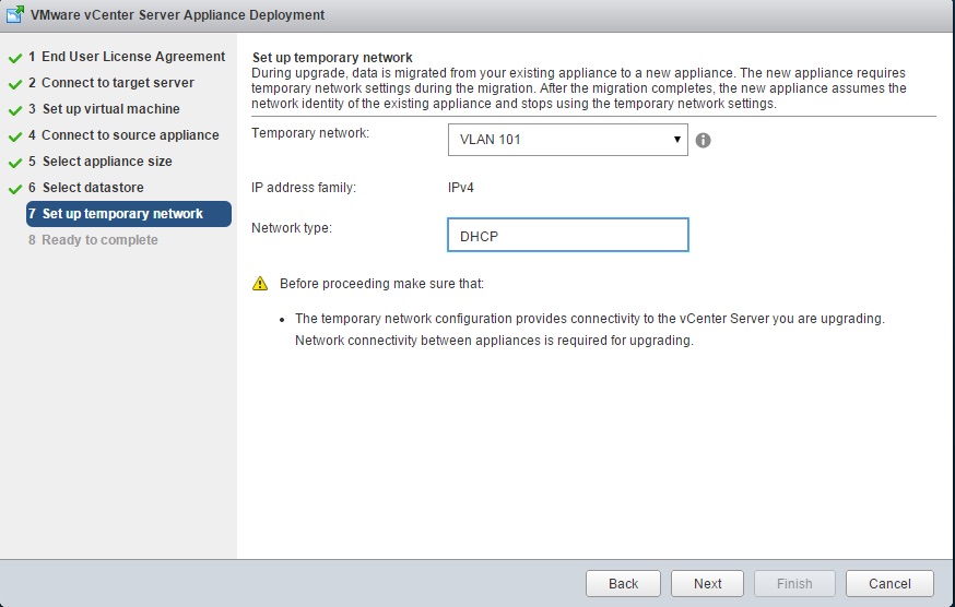 7. Next you will choose the network that you want to assign. I did DHCP network because as part of the migration the “actual IP and DNS name” will move to the new appliance.